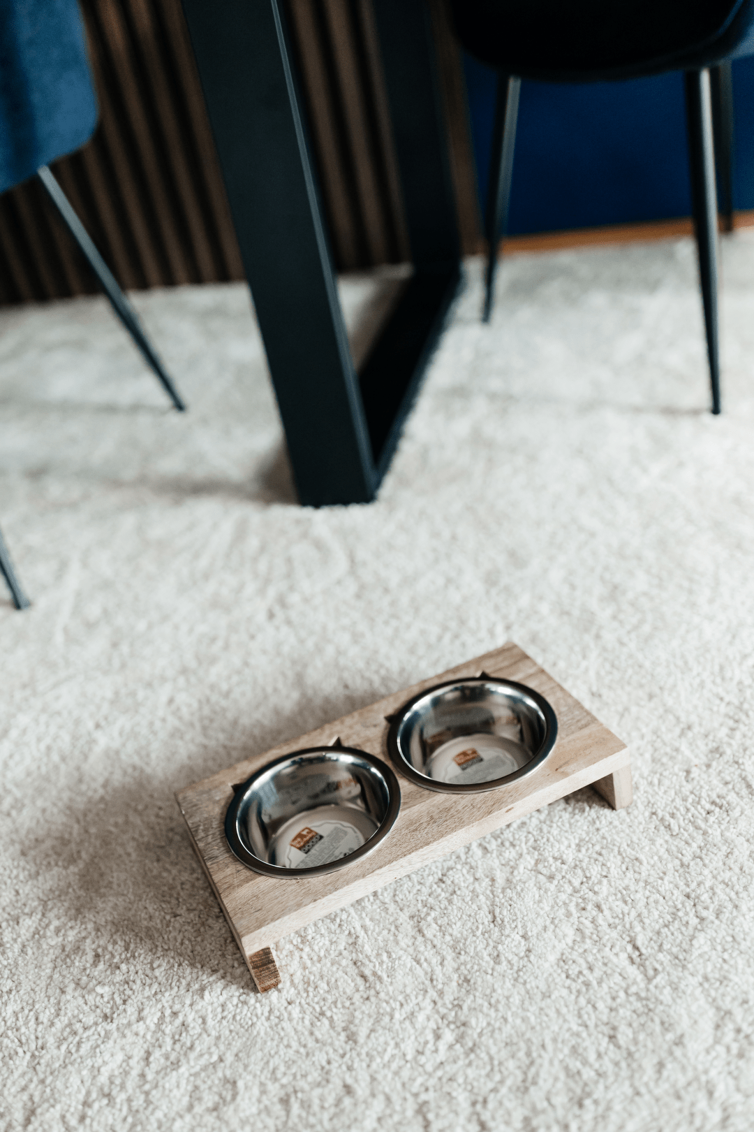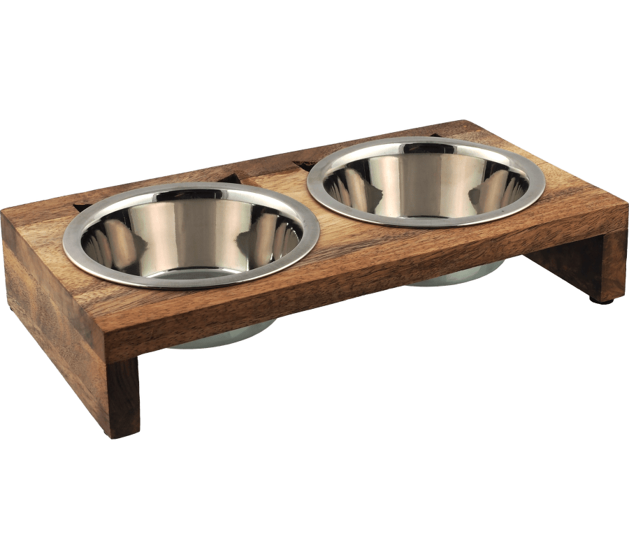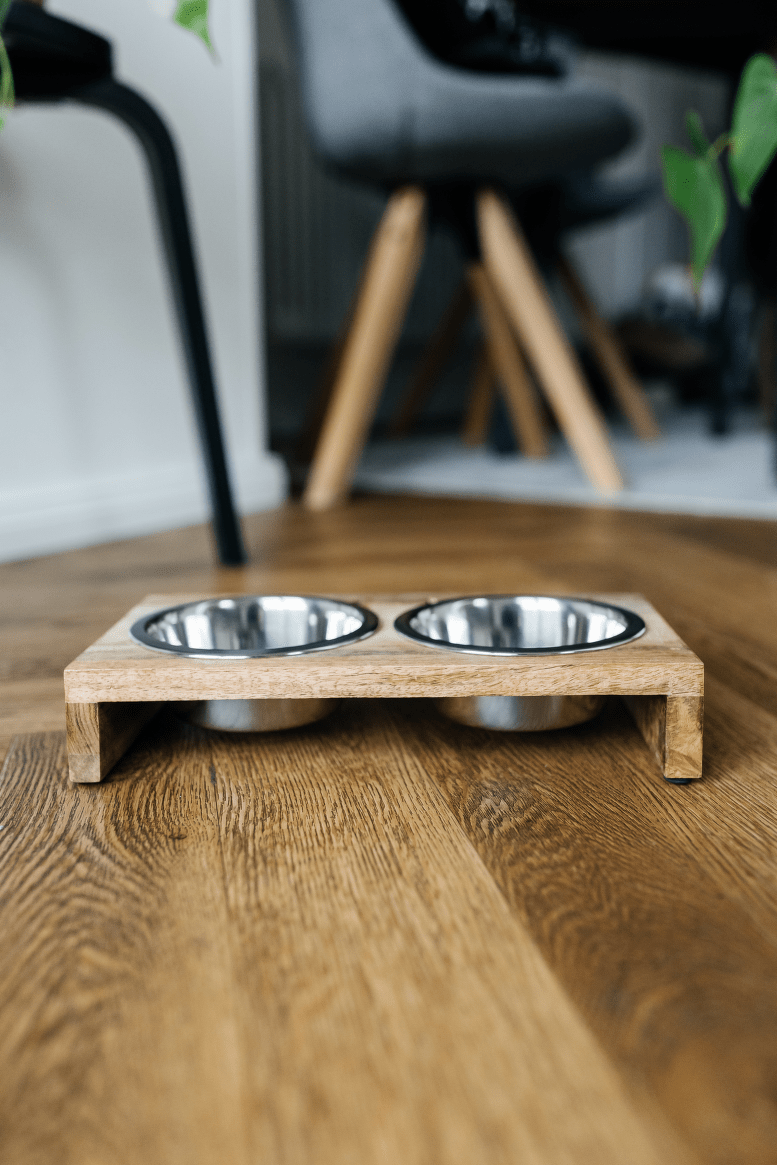 Praktická sada dvou nerezových misek v elegantním dřevěném stojánku. Ideální řešení pro podávání vody i krmiva, které spojuje funkčnost a moderní design.