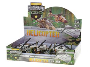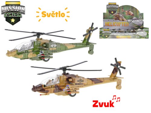 Poříďte si celou armádu a vyrazte do bitvy. Vojenská kovová helikoptéra z kolekce Mission Control má velikost 20 cm. Helikoptéra je na zpětný chod, svítí a vydává zvuk. Dostupné jsou 2 barvy - hnědá, zelená. Vhodné pro děti od 3 let.