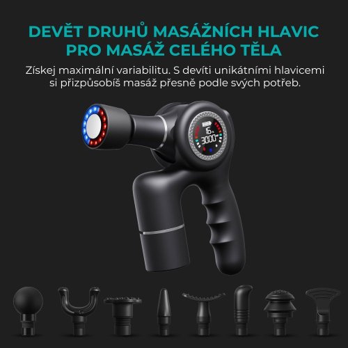 Součástí výbavy je 9 vyměnitelných masážních hlavic, které jsou určeny pro různé druhy masáží, skupiny svalů nebo kloubů. Masáž si tak přizpůsobíte podle svých potřeb, abyste dosáhli požadovaného účinku. Můžete se zaměřit na regeneraci, uvolnění napětí, bolesti nebo se nechat jen hýčkat, podpořit prokrvení a relaxovat. Díky bohaté nabídce je masážní pistole MISURA MBXPro univerzální zařízení, které zvládne rozmanité druhy – od horké komprese až po jemné vibrace.