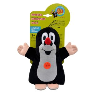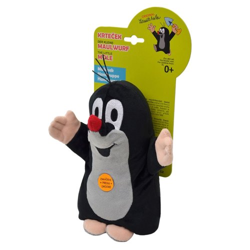 Plyšový maňásek na ruku, mírně vycpaný, oči vyšívané. Krteček po zmáčknutí náhodně přehrává originální zvuky z pohádek o Krtečkovi.