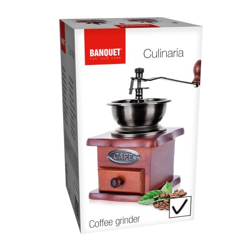 Ruční mlýnek na kávu s keramickým mechanismem, dřevěné tělo s kovovou násypkou, vyjímatelná dřevěná zásuvka na mletou kávu. Keramickou mlecí mechaniku lze nastavit na požadovanou hrubost mletí.