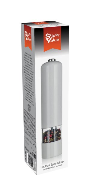 Elektrický mlýnek na koření SUPER VALUE je dodáván v plastovém provedení, zásobníky jsou akrylové. Vnitřní část mlýnku tvoří keramická mlecí mechanika. Zdroj napájení 4 x AA tužkové baterie a nejsou součástí výrobku.