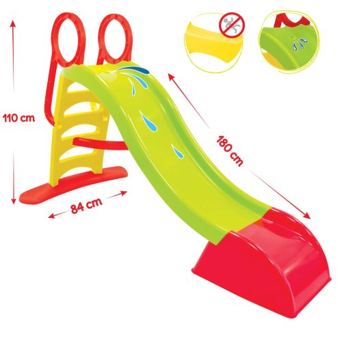 Vaše zahrada se promění v zábavné hřiště! Možnost připojení zahradní hadice. Skluznou plochu můžete vlhčit pro snadnější a zábavnější klouzání. Vhodné pro vnitřní i venkovní vyžití. Klouzačka má na svém povrchu UV filtr, který ji chrání před slunečním zářením a proto zůstanou barvy zářivé po dlouhou dobu. Díky pevným a stabilním schůdkům s protiskluzovu úpravou je bezpečná. Kulaté a hladké úchyty v horní části schodů dávají dětem pocit bezpečí při hraní. Délka skluzavky je 180 cm. Maximální nosnost 50 kg. Rozměry: 180 x 84 x 110 cm Poznámka: Dodáváno v rozloženém stavu. Vhodné pro děti od 2 let.