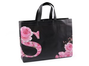 Do velké tašky z [laminované] netkané textilie s potiskem růží naskládáte plno věcí.