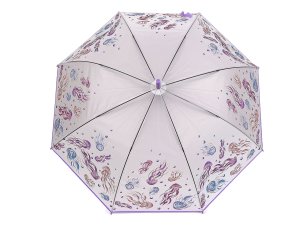 Průsvitný deštník s barevným potiskem bude slušet dívkám i ženám.