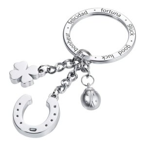 Klíčenka se 3 přívěsky - podkova, čtyřlístek a beruška.