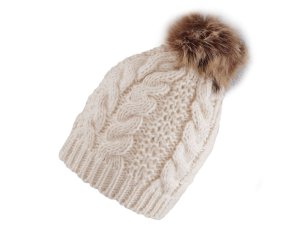 Pletená čepice s velkou bambulí má poutavou strukturu s copánkovým vzorem.