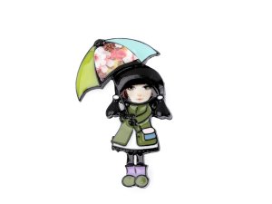 Brož holčičky s deštníkem je ozdobená barevným smaltem.