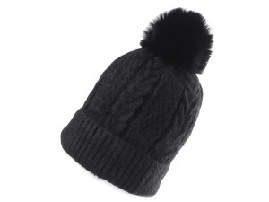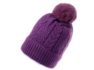 Pletená čepice s velkou bambulí má poutavou strukturu s copánkovým vzorem.