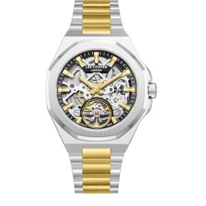 Pánské náramkové hodinky Mechanický pohon Průměr pouzdra 44,0 mm Pouzdro ve tvaru kruhu Kovové pouzdro Stříbrná barva pouzdra Kovový tah Stříbrná/zlatá barva tahu Ručičkový ciferník Ciferník s dvanácti …