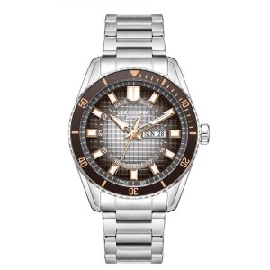 Pánské náramkové hodinky Napájení z baterie Průměr pouzdra 42,0 mm Pouzdro ve tvaru kruhu Kovové pouzdro Stříbrná barva pouzdra Kovový tah Stříbrná barva tahu Ručičkový ciferník Hnědá barva ciferníku …