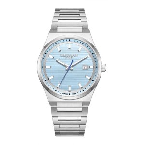 Pánské náramkové hodinky Napájení z baterie Průměr pouzdra 42,0 mm Pouzdro ve tvaru kruhu Kovové pouzdro Stříbrná barva pouzdra Kovový tah Stříbrná barva tahu Ručičkový ciferník SVETLO MODRÁ barva ciferníku …