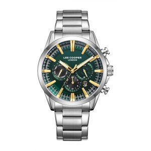 Pánské náramkové hodinky Napájení z baterie Průměr pouzdra 42,0 mm Pouzdro ve tvaru kruhu Kovové pouzdro Stříbrná barva pouzdra Kovový tah Stříbrná barva tahu Ručičkový ciferník Zelená barva ciferníku …