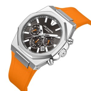 Pánské náramkové hodinky Napájení z baterie Průměr pouzdra 44,0 mm Pouzdro ve tvaru osmihranu Kovové pouzdro Stříbrná barva pouzdra Oranžová barva tahu Ručičkový ciferník Šedá barva ciferníku Ciferník …