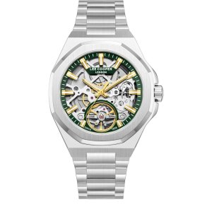 Pánské náramkové hodinky Napájení z baterie Průměr pouzdra 42,0 mm Pouzdro ve tvaru kruhu Kovové pouzdro Stříbrná barva pouzdra Kovový tah Stříbrná barva tahu Ručičkový ciferník Zelená barva ciferníku …