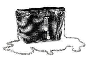 Elegantní stahovací kabelka ozdobená broušenými kamínky se efektně třpytí.