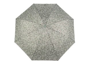 Velký dámský deštník s potiskem malých květů je vystřelovací, konstrukci má z kovového drátu a pružných lamel, které tvoří osm polí.