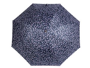 Velký dámský deštník s potiskem malých květů je vystřelovací, konstrukci má z kovového drátu a pružných lamel, které tvoří osm polí.