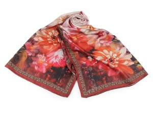 Elegantní saténový šátek s motivem velkých barevných květů.