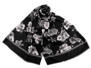 Elegantní saténová šála s květy je lehounká a měkká, na dotek připomíná hedvábí.