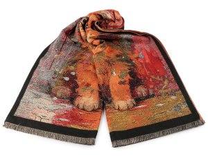 Velká šála typu kašmír je vyrobená z hřejivého materiálu, který je příjemně hebký na dotek. [Je ozdobená obrázky různých koček].
