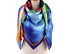 Elegantní saténový šátek s motivem velkých barevných květů.