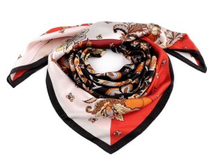 Saténový šátek s potiskem je velice kvalitní, elgantní, využijete jej na každodenní nošení.