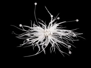 Velká elegantní brož je ozdobená perlami, broušenými korálky a nadýchaným pštrosím peřím.