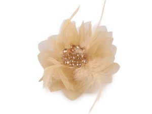 Velká elegantní brož je vyrobená z jemného šifonu, který připomíná květinu, a její střed je zdobený peřím a třpytivými broušenými korálky, které jí dodávají luxusní vzhled.