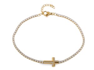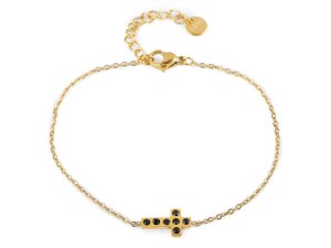 Náramek z nerezové oceli má poutavý detail v podobě křížku s broušenými kamínky.