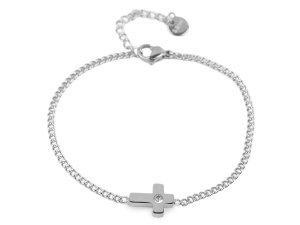 Náramek z nerezové oceli má poutavý detail v podobě křížku s broušeným kamínkem.
