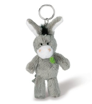 Malý šedý plyšový oslík jako talisman pro štěstí na klíčenku.