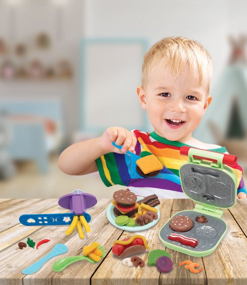 Modelína, ve které jsou různá tvořítka a formičky na výrobu hamburgeru. Včetně modelovací hmoty.