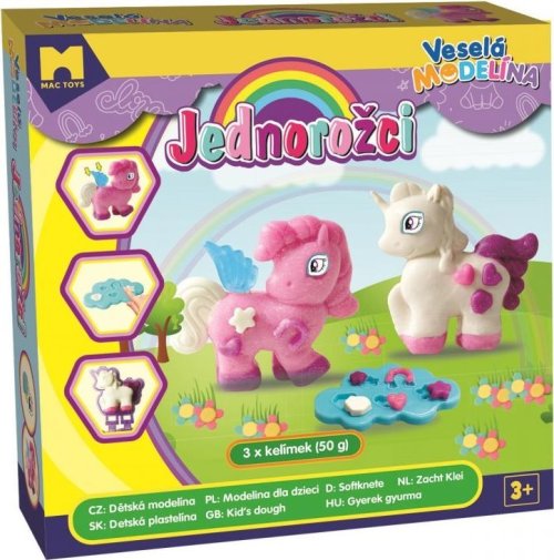 Modelína je lehce tvarovatelná, nevysychá a v uzavřené doze netvrdne. Sada je barevně i tématicky laděna do světa jednorožců. Veselá modelína obsahuje 3x kelímek 50 g, 2 tvořítka na výrobu jednorožců, křídla a nožičky pro jednorožce, nůžky, tvořítko na odzobu jednorožce a další příslušenství.