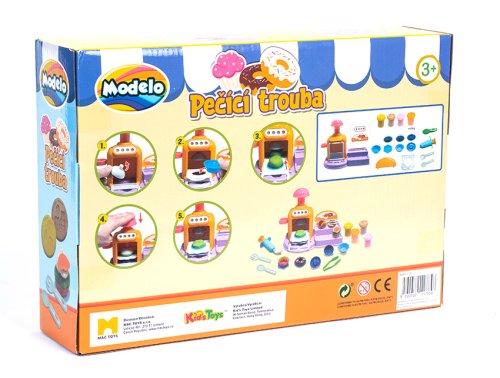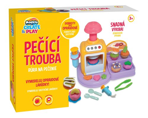 Sada modelíny, velké množství tvořítek a pečící trouba, ve které si děti upečou své dobroty. Vymodeluj dortík a dej do do trouby.