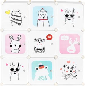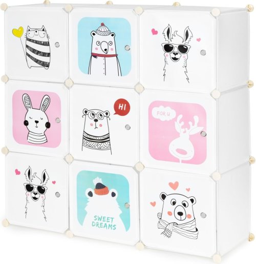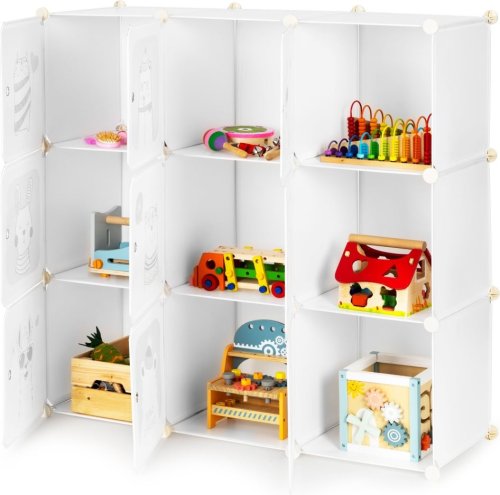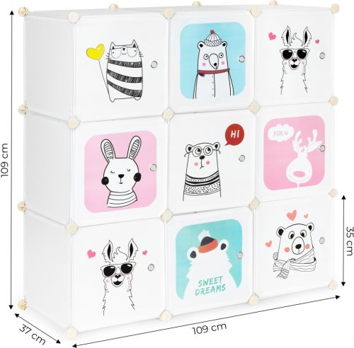 modulární skříňka se skládá z 9 polic (přihrádek), které lze libovolně aranžovat, aby se nábytek přizpůsobil individuálním potřebám a preferencím dítěte lehká konstrukce vyrobená z odolných panelů z polypropylenu (ABS), které jsou posíleny kovovým rámem pro dodatečnou pevnost a stabilitu každá z polic může pojmout až 3 kg zatížení, což je ideální místo na knížky, plyšové hračky nebo kostky rozměry skříňky: 109 x 109 x 37 cm výška jedné přihrádky: 35 cm