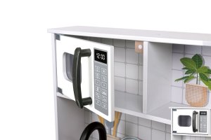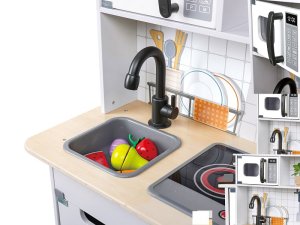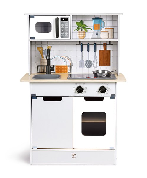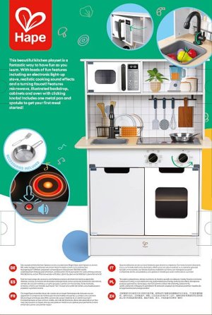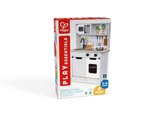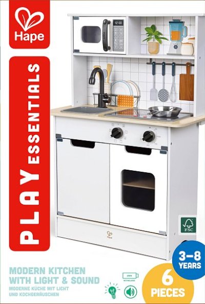 Hape Moderní kuchyňka se světlem a zvukem. Vstupte do světa současného vaření s moderní kuchyňkou Hape, která je navržena pro pohlcující zážitek. Kuchyňka nabízí realistické světelné a zvukové efekty, které věrně napodobují atmosféru rušné kuchyně a dělají hru ještě zábavnější. Obsahuje všechny nezbytné kuchyňské spotřebiče a náčiní: sporák, troubu, dřez, lednici a další doplňky. Vyrobena z netoxických materiálů s oblými hranami, takže poskytuje bezpečné a bezstarostné prostředí pro hraní. Povzbuzuje děti k tvořivé hře a umožňuje jim zkoušet různé kuchařské scénáře a role šéfkuchařů. Baterie: 2 x AA, nejsou součástí. Hmotnost kuchyňky: 9,5 kg. Rozměry kuchyňky: 85,5 x 59,8 x 29,7. Rozměry balení: 43 x 62,3 x 14,7 cm. Věk: 3+