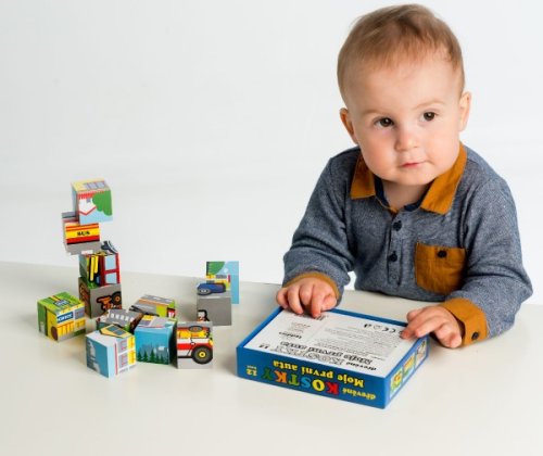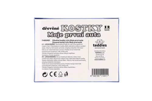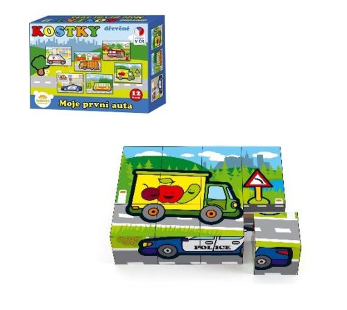 Dřevěné kostky s obrázky dopravních prostředků. Kostky s motivy aut jsou uloženy v praktické papírové krabičce. Balení obsahuje předlohy pro snadnější skládání. Vhodné od 3 let.