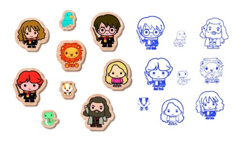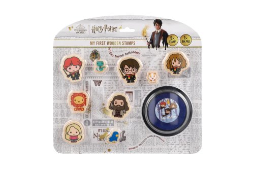 Set obsahuje 9 tvarovaných dřevěných razítek a modrou inkoustovou podušku, vše v oblíbených dětských motivech.