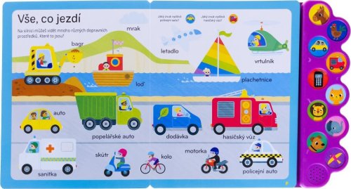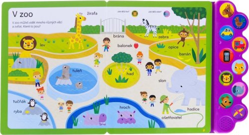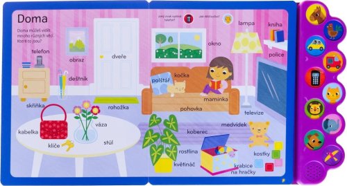 Učte se a procvičujte s dětmi s touto báječnou zvukovou knihou první slova! Na stránkách se představují tematické skupiny prvních slovíček, které doprovází otázky, a tlačítka po straně se zvuky toto poznávání skvěle doplňují. Kniha obsahuje roztomilé a názorné ilustracemi, o kterých si děti mohou s dospěláky dále povídat a rozšiřovat si tak slovní zásobu, ale také užít si společný čas čtení. Deset tlačítek se zvuky děti obohatí o veselé štěkání, troubení či houkání.
