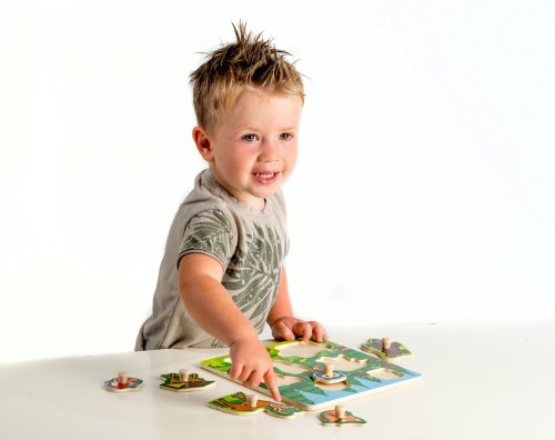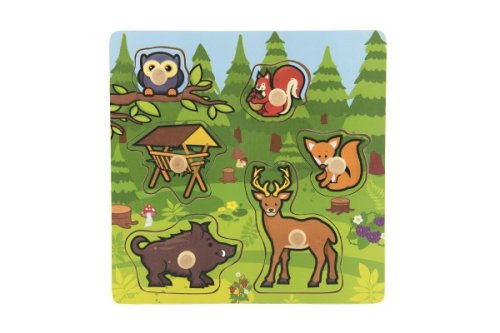 Obsahuje 6 dílků s úchyty, které musí děti správně umístit do dřevěné desky s otvory tak, aby získaly obrázek lesa se zvířátky. Velikost: 22,5 x 22,5 x 2,5 cm Vhodná od 12 měsíců
