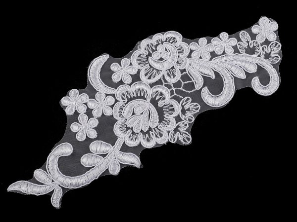 Monofilová vsadka působí díky květinovému designu velmi elegantně. Vynikne na společenských a plesových šatech, halenkách, svetrech, [spodním prádle, riflích] atd. Je vhodná také na ozdobení doplňků jako jsou psaníčka nebo kabelky. Můžete ji i nalepit jako dekoraci na sklo či našít na polštář apod. Balení obsahuje 2 kusy.