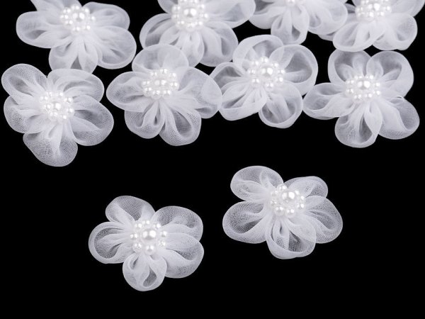 Něžný monofilový květ je velice romantický. V jeho středu jsou našité skleněné perličky s perleťovým leskem. [Upozorňujeme zákazníky, že skleněné perličky se mohou lišit, mohou mít různou povrchovou úpravu - s leskem, s AB efektem, mírně odlišné odstíny apod.] Použití: Květ můžete našít jako dekoraci na oděvy, například na společenské šaty, halenky, trička nebo svetry. Je vhodný i na zdobení klobouků, čepic a čelenek do vlasů. Můžete ho také pomocí lepidla přilepit na brožový můstek a vytvořit zajímavý šperk.