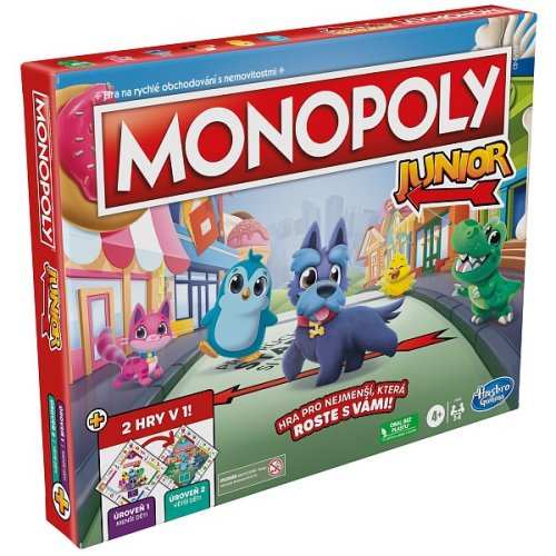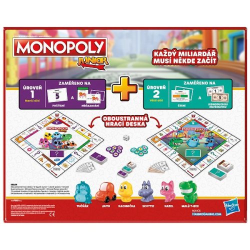 Tato nová verze obsahuje oboustrannou hrací desku pro 2 způsoby hry! Díky jednoduché hratelnosti a lokalitám vhodným pro děti je tato hra skvělým vstupem do hry Monopoly. Hra, která roste s vašimi dětmi! Jedna strana je určena pro mladší děti (4+), a když ji otočíte, najdete pokročilejší hru pro starší předškoláky! Hra obsahuje sadu karet pro každou úroveň. Mladší děti mohou hrát s dolarovými bankovkami a starší děti mohou použít balíček pětidolarovek. Hra obsahuje žetony inspirované klasikou a představuje 2 nové žetony.