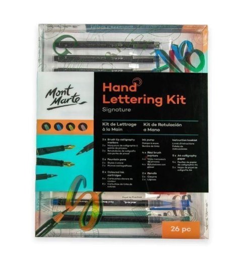 Kaligrafická sada- 3 fixy se štětečkovým hrotem (černé), 4 fixy se štětečkovým hrotem (barevné), 2 plnící pera, 8 barevných inkoustových náplní, 1 inkoustová pumpička (plnítko), 2 grafitové tužky, 5x cvičné listy A4 70 g/m2.