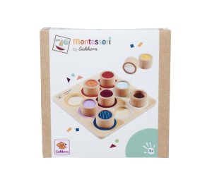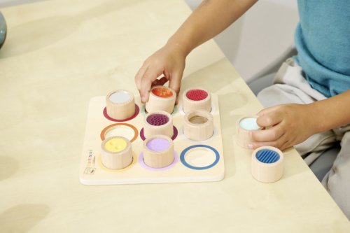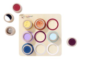 Vnímání je pro dítě důležitým smyslovým vývojem. Hra s různými povrchy a materiály podporuje hmat. Naše Montessori hmatová deska má 9 senzorických válců, ve kterých si dítě může osahat povrchy a textury. Montessori hmatová deska je vyrobena ze 100% bukového dřeva a překližky s certifikací FSC a je vhodná pro děti od 3 let.