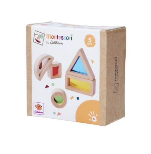 Montessori smyslové kostky v 5 různých tvarech jsou vzrušující záležitostí. Barevná akrylová skla přímo vybízejí k objevování. Děti mohou pozorovat svět skrz barevnou čočku. Zejména kostka se zrcadlovou fólií ohromí ty nejmenší. Pětidílná sada obsahuje trojúhelník, obdélník, čtverec, kruh a fólii se zrcadlem. Smyslové kostky Eichhorn jsou vyrobeny ze 100% bukového dřeva s certifikátem FSC a jsou vhodné pro děti od 1 roku.