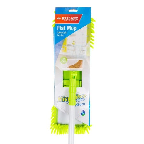 Plochý žinylkový mop od značky BRILANZ vám usnadní pravidelné mytí podlah v domácnosti. Díky teleskopické tyči nastavitelné od 68 do 120 cm už se nebudete muset k úklidu ohýbat. Materiál zvaný žinylka, složený z 80 % polyesteru a 20 % polyamidu, dokonale čistí všechny podlahové krytiny. Bílá ocelová tyč se světle zelenými plastovými prvky skvěle padne do ruky. Hlavici můžete snadno vyměnit, na výběr máte hned z několika barevných provedení.