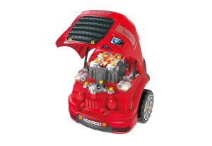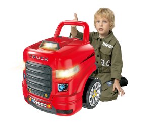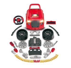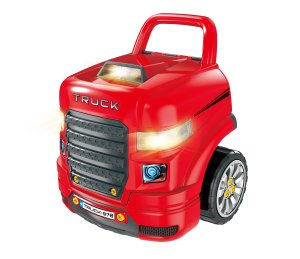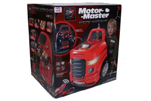 Motor šroubovací na dálkové ovládání - kamion. Infračervený port. Rozměry 40x39x47 cm. Obsahuje 61 součástek. Klíče na dálkové ovládání (tlačítka pro odemčení, zamčení, klakson). Svítící přední světla, klakson, řadící páka, výstražné světlo, startovací tlačítko, odklápěcí kapota, osvětlení motoru, měření oleje. Světelné a zvukové efekty. 3xAA pro motor nejsou součástí, 1xCR2055 pro klíče součástí.