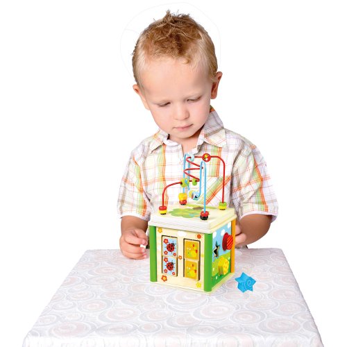 Tato motorická kostka nabízí rozmanitost a zábavu při hraní. Na stěnách této kostky mohou děti rozvíjet své vizuální vnímaní, motorické dovednosti a logiku. Díky promyšlenému zpracování hračky a její mnohofunkčnosti se děti naučí rozeznávat základní tvary a barvy. Na vrchní straně kostky je umístěn motorický labyrint.